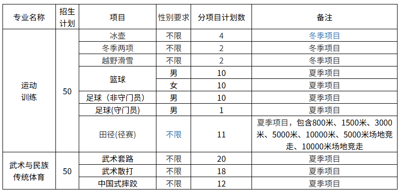 2026年运动训练本科专业招生计划50名,武术与民族传统体育本科专业招生计划50名,实际招生计划以上级部门下达为准,具体分专业招生项目如下: